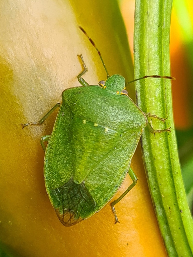Sicheres Kennzeichen der Grünen Reiswanze: die 3 weißen Punkte am Rückenschild